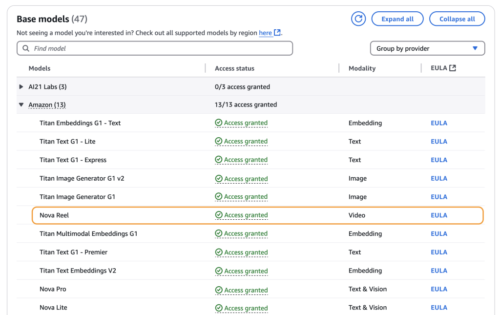If you are a newcomer in using the Amazon Nova Reel models, go to the Amazon Bedrock Console console, choose to select Access to the model in the navigation panel and a request for access to Amazon Nova Reel Model. When you get access to Amazon Nova Reel, both 1.0 and 1.1.